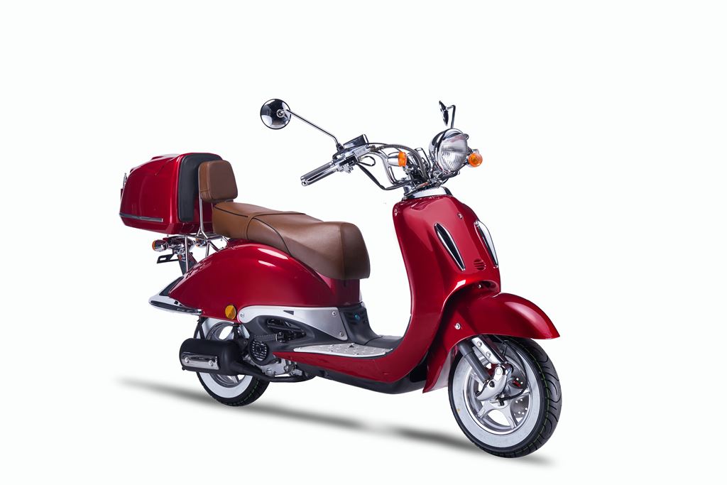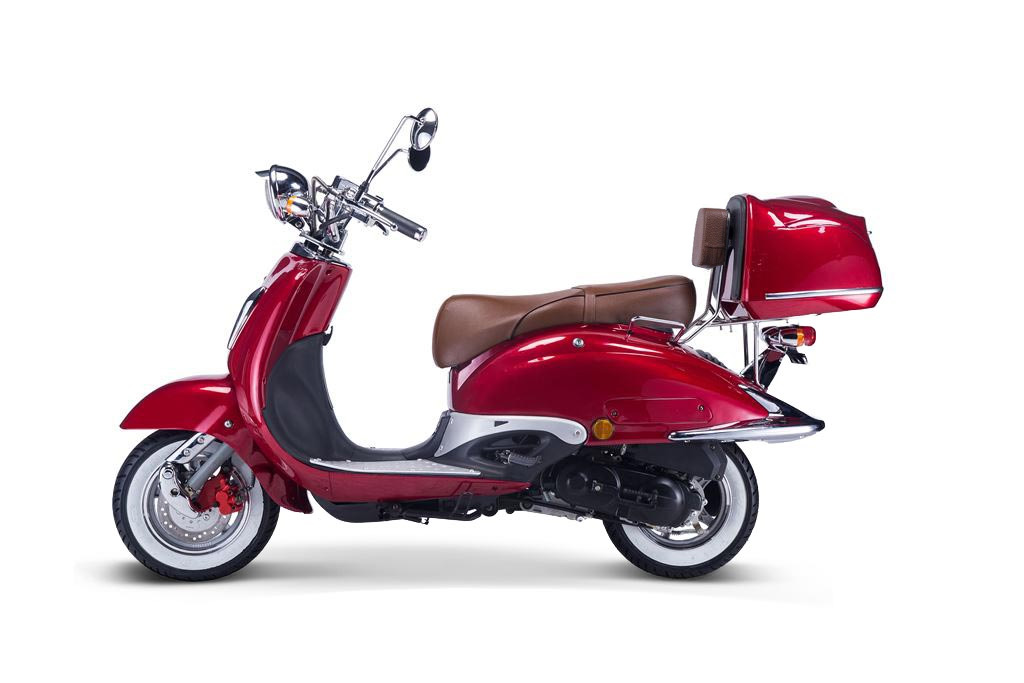 TECHNO CLASSIC 2.0 RETRO ROLLER 50ccm rot mit Topcase und brauner Sitzbank