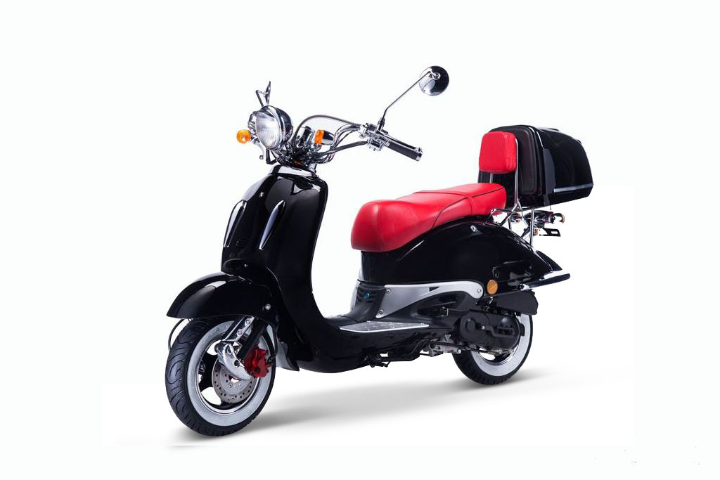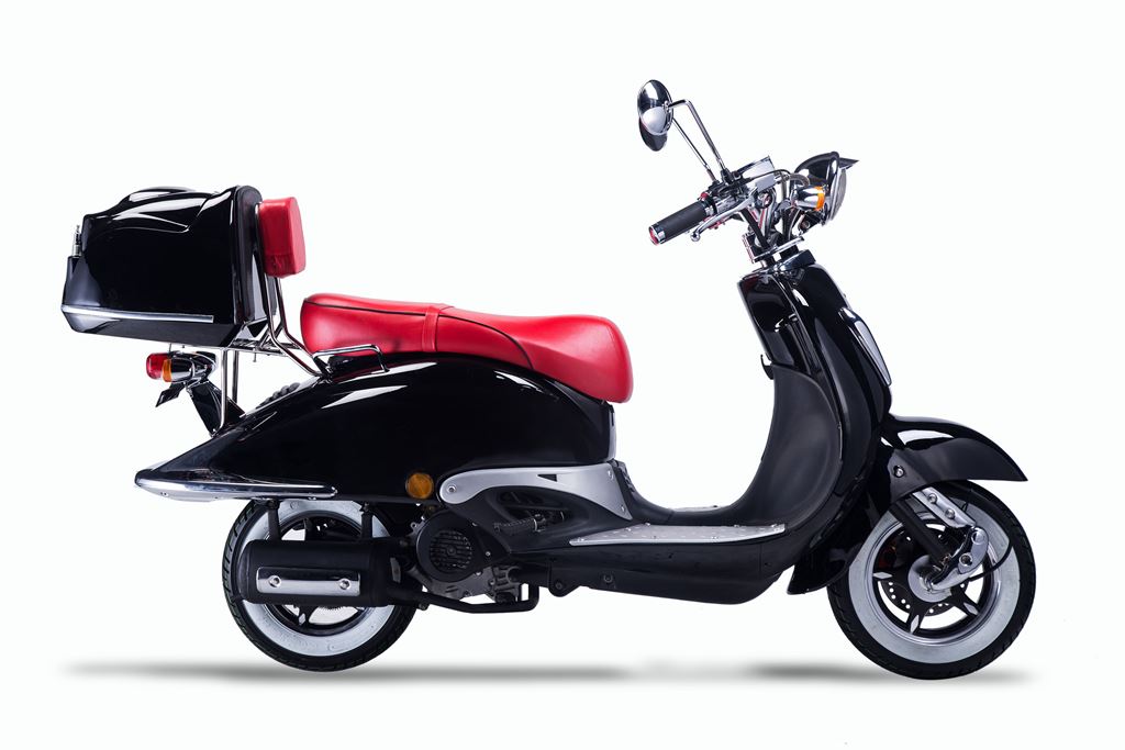 TECHNO CLASSIC 2.0 RETRO ROLLER 50ccm schwarz mit Topcase und roter Sitzbank